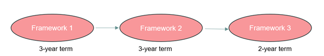 This means that you have a series of frameworks being awarded one after the other. When the current framework is reaching expiry, you reopen competition for the next framework in the scheme, and on expiry of the current framework, enter into the next one and so on, provided that: